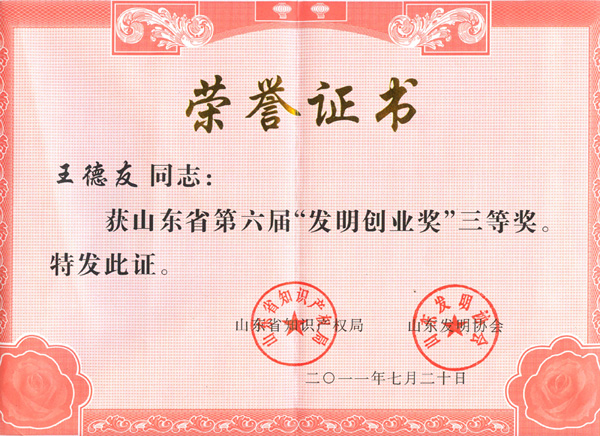 近日,從山東省知識產(chǎn)權(quán)局傳來喜訊(魯發(fā)協(xié)[2011]8號),集團(tuán)總裁王德友喜獲山東省第六屆發(fā)明創(chuàng)業(yè)三等獎。