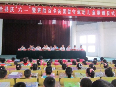 為幫助農(nóng)村貧困留守流動(dòng)兒童繼續(xù)學(xué)業(yè),努力營(yíng)造關(guān)愛貧困兒童健康發(fā)展的良好環(huán)境,2011年5月31日,沂水縣婦聯(lián)在第三實(shí)驗(yàn)小學(xué)舉行了全縣慶“六一”暨資助百名貧困留守流動(dòng)兒童捐贈(zèng)儀式, 儀式現(xiàn)場(chǎng)向30名留守流動(dòng)兒童代表各發(fā)放500元資助金、書包及食品。這次活動(dòng)全縣有170余名貧困留守流動(dòng)兒童接受愛心人士資助,資助金額達(dá)10萬余元。魯洲集團(tuán)一次就結(jié)對(duì)資助了102名貧困留守流動(dòng)兒童。